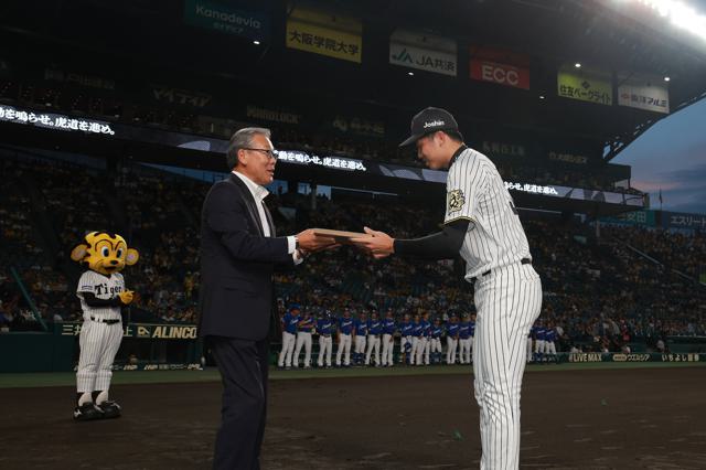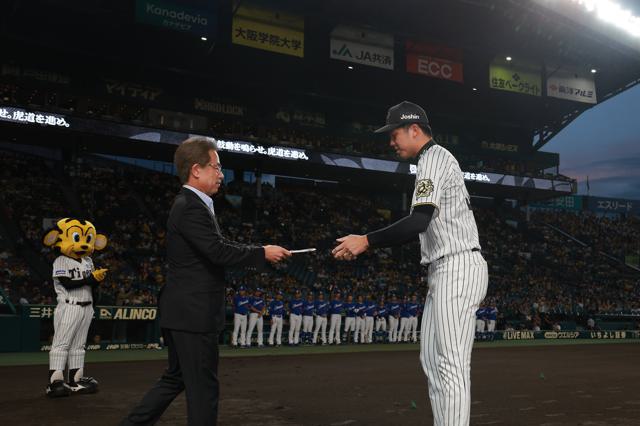 26日(金)、阪神甲子園球場での対中日ドラゴンズ戦の試合前に、「8月度大樹生命月間MVP賞」を受賞した才木浩人選手の表彰式が行われました。