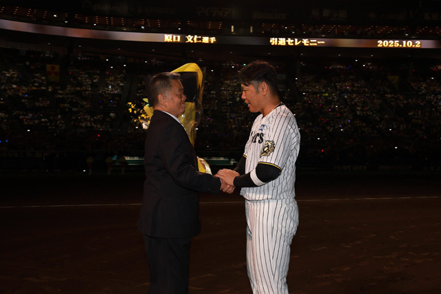 2日(木)、今シーズン最終戦となった対東京ヤクルトスワローズ戦終了後に、今季限りで引退する原口文仁選手の引退セレモニーを実施しました。