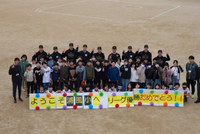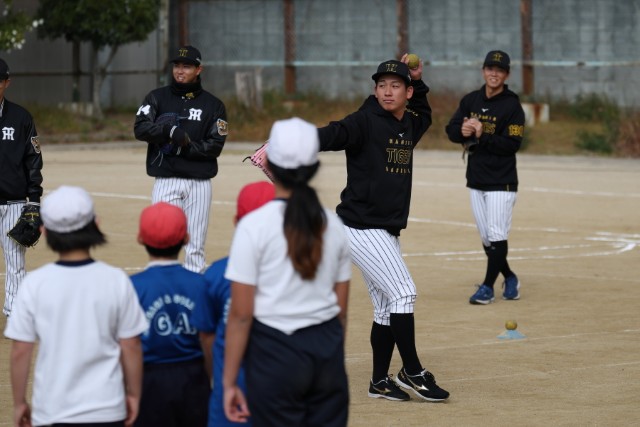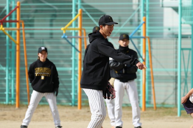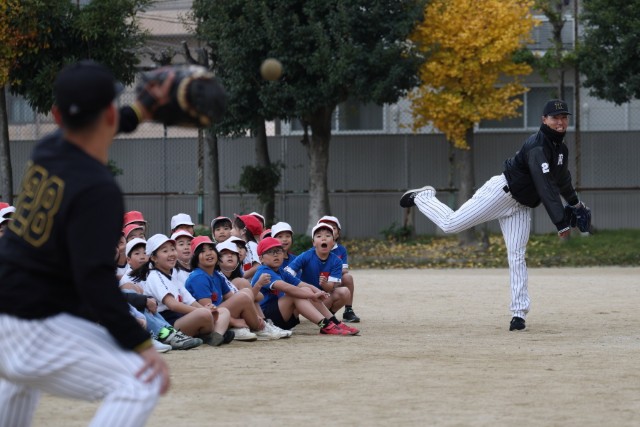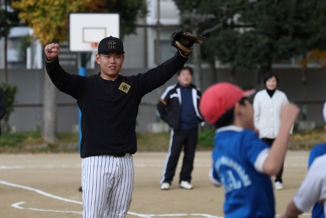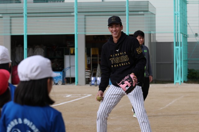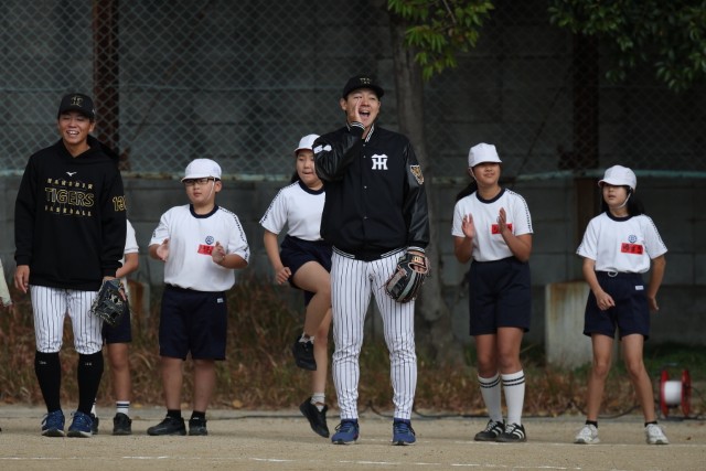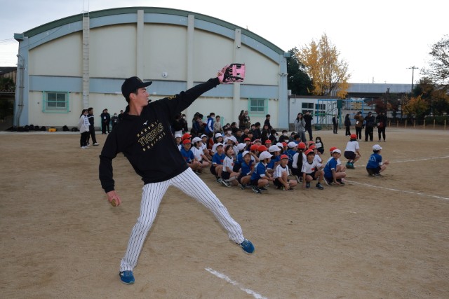 3日(水)、伊原陵人選手、今朝丸裕喜選手、木下里都選手、工藤泰成選手、嶋村麟士朗選手、早川太貴選手、川﨑俊哲選手、津田淳哉選手、福島圭音選手、そしてタイガースアカデミーの歳内宏明コーチ、角菜帆コーチが「尼崎市立浦風小学校」を訪問し、ゲストティーチャーとして約114名の小学3年~6年生の皆さんと、ボールの投げ方を中心とした練習や、選手とのキャッチボール、対戦型ゲームなどをして野球の面白さや楽しさを伝えました。