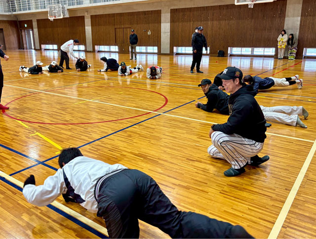 講習会は投手編・野手編の2部制にて実施し、参加者への事前アンケートにてヒアリングした、指導に関する疑問・悩みの解消に繋がる練習メニューの提案を行ったほか、技術向上に重要な体の部位のストレッチ法指導、さらには中学生への実技指導を交えた指導方法の講習・レクチャーを行いました。