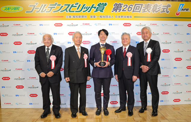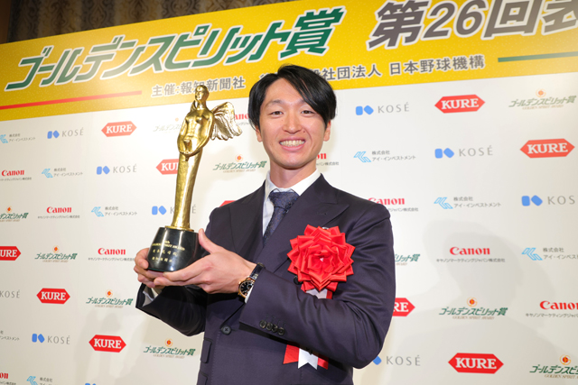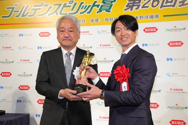 9日(火)、11月6日(木)に受賞者が発表された「第26回ゴールデンスピリット賞」の授賞式が東京都内で行われ、近本光司選手が出席しました。